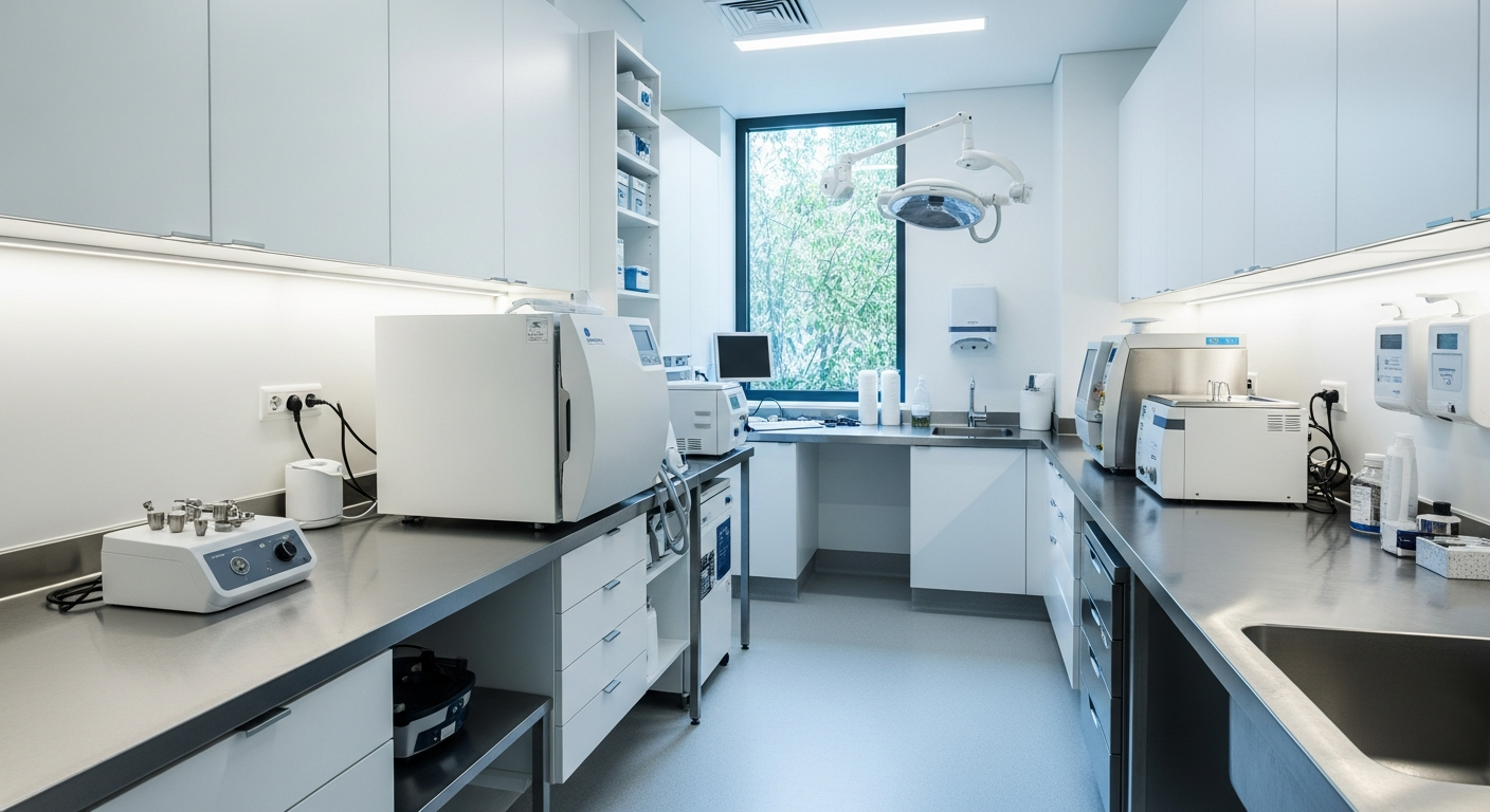 Recuerda vertebrar el espacio mediante el flujo unidireccional, seleccionando materiales continuos y lavables, e instalando la maquinaria técnica requerida, prestando especial atención al autoclave de clase B y al control de trazabilidad. Un local proyectado bajo estas premisas desde el primer día agiliza drásticamente las tramitaciones sanitarias.