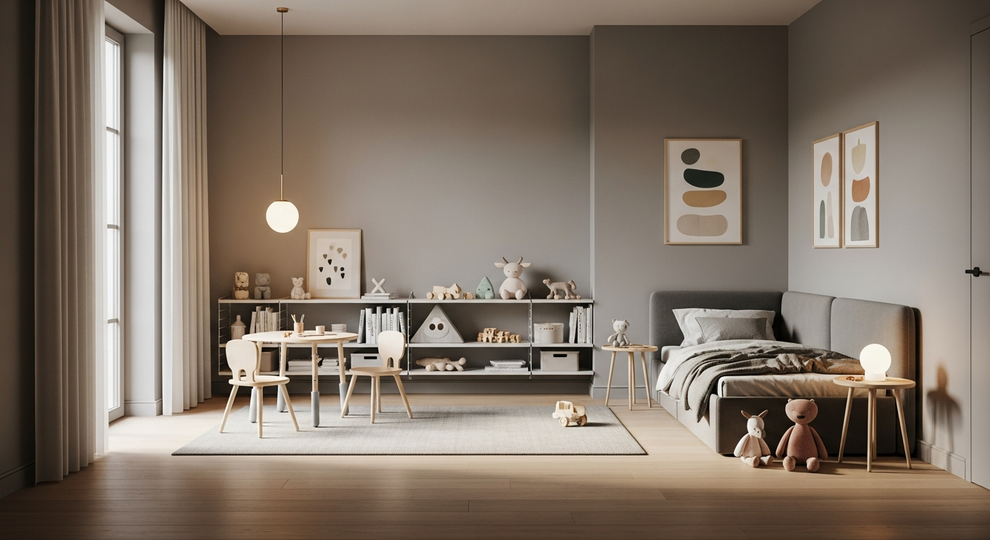 Los tonos arena sutiles, los grises cálidos, los blancos rotos y los verdes empolvados son elecciones magistrales. Estas tonalidades técnicas proporcionan un fondo visual sereno que facilita la introducción de notas de color vibrantes a través de textiles, cuadros decorativos o juguetes; elementos accesorios que pueden sustituirse ágilmente y con muy bajo coste conforme evolucionan los gustos personales del niño.