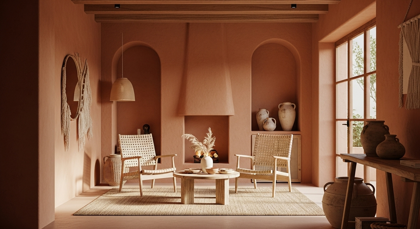 - Salón: Pinta una pared de acento en color terracota, utiliza un sofá de lino en tono crudo y añade calidez con una gran alfombra de yute y lámparas de ratán.