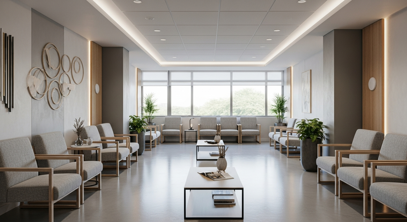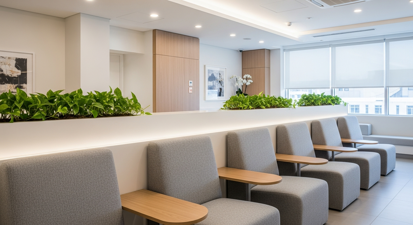 - Tecnología y servicios: Prevé enchufes para cargar dispositivos móviles, conexión Wi-Fi (si se ofrece) y quizás pantallas informativas. Estos detalles mejoran la experiencia del paciente.