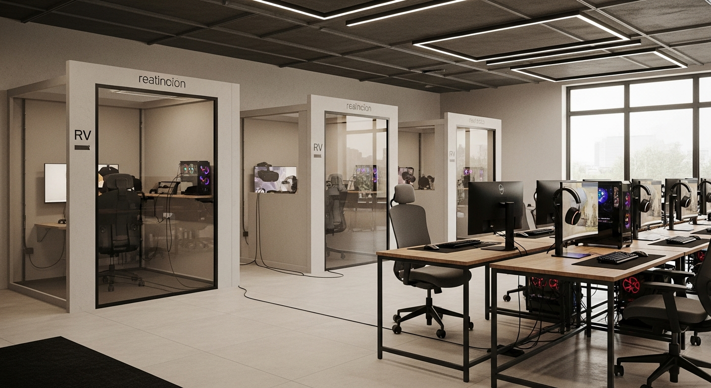 • Áreas de Juego Individual (Boxes de RV): Son el corazón de tu negocio. Para una experiencia inmersiva y segura, cada puesto de Realidad Virtual necesita un espacio diáfano y libre de obstáculos. Se recomienda un área mínima de 3×3 metros por jugador, aunque lo ideal es acercarse a los 4×4 metros. La altura del techo también es crucial, necesitando al menos 2,5 metros libres para permitir el movimiento de los brazos y el correcto funcionamiento de los sensores de posicionamiento.