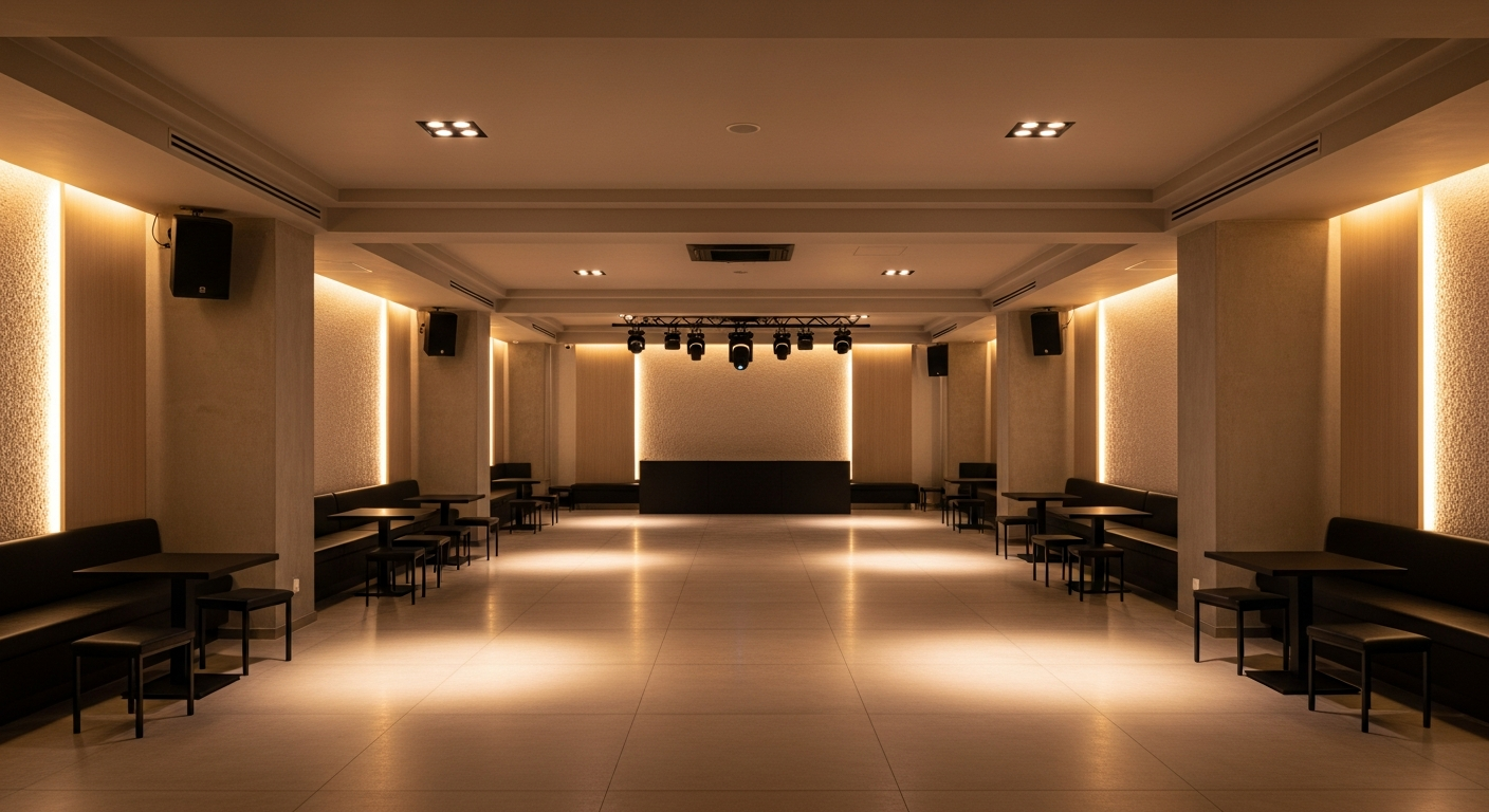Integra los materiales fonoabsorbentes y acústicos dentro del propio concepto decorativo. Las espumas, los paneles ranurados y los revestimientos ignífugos actuales ofrecen acabados visualmente muy atractivos. Planifica la iluminación para que actúe simultáneamente como elemento funcional de seguridad en las vías de evacuación y como herramienta fundamental para crear atmósferas inmersivas en la pista de baile.