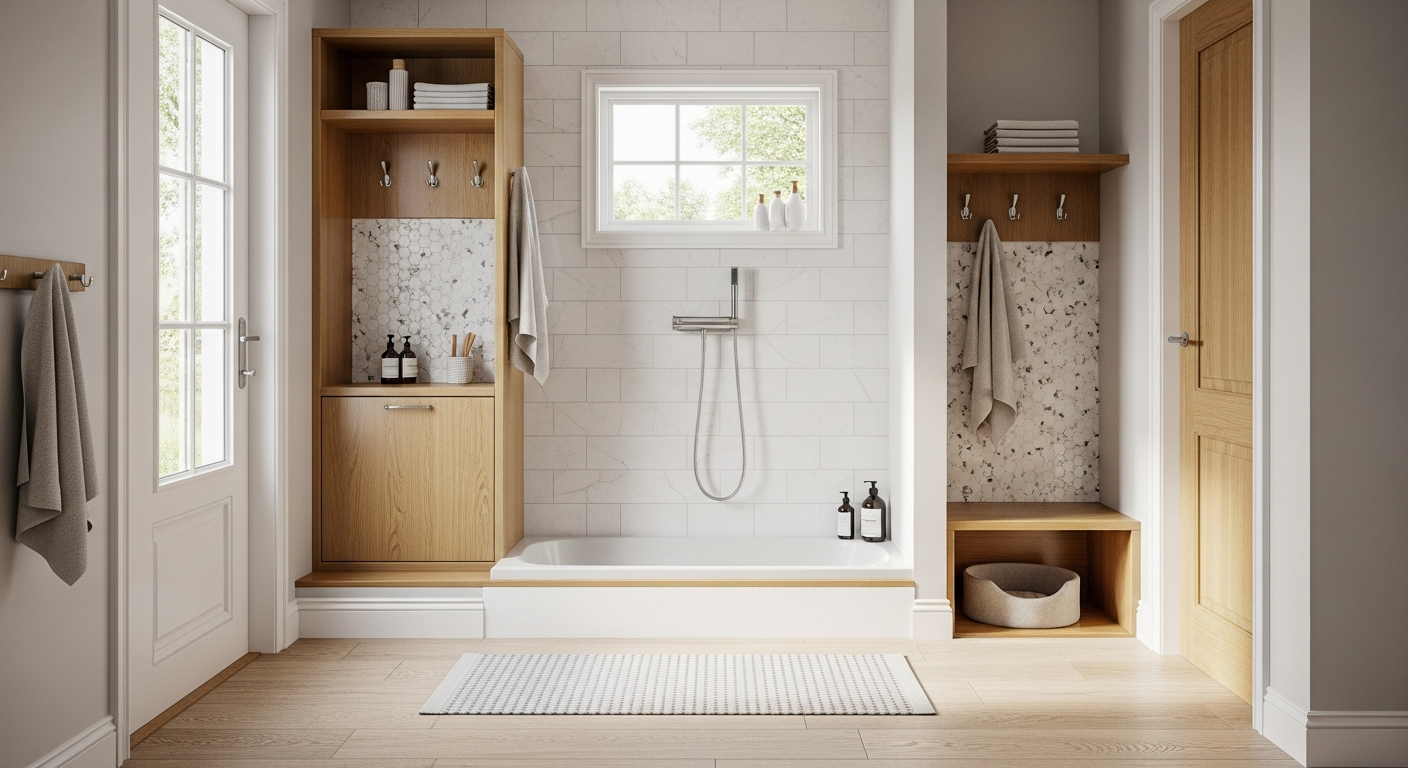 Si dispones de espacio en la entrada o en una zona de paso hacia el jardín, crear una pequeña estación de limpieza es una de las mejores decisiones que puedes tomar. Este espacio, conocido como mudroom, actúa como un filtro entre el exterior y el interior de tu hogar. No necesita ser muy grande, pero sí funcional.