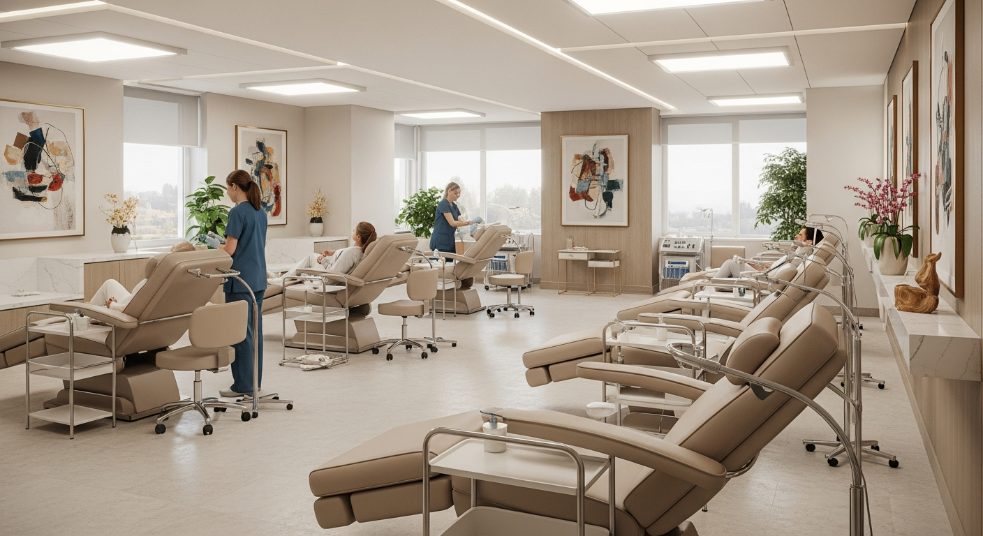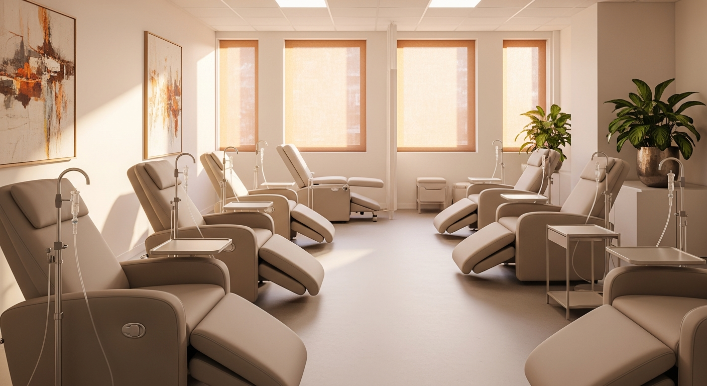 Además, esta zona requiere un control de enfermería que tenga visión directa de los pacientes. No sirve un mostrador en la entrada; el personal sanitario debe poder monitorizar visualmente a quien está recibiendo el suero.
