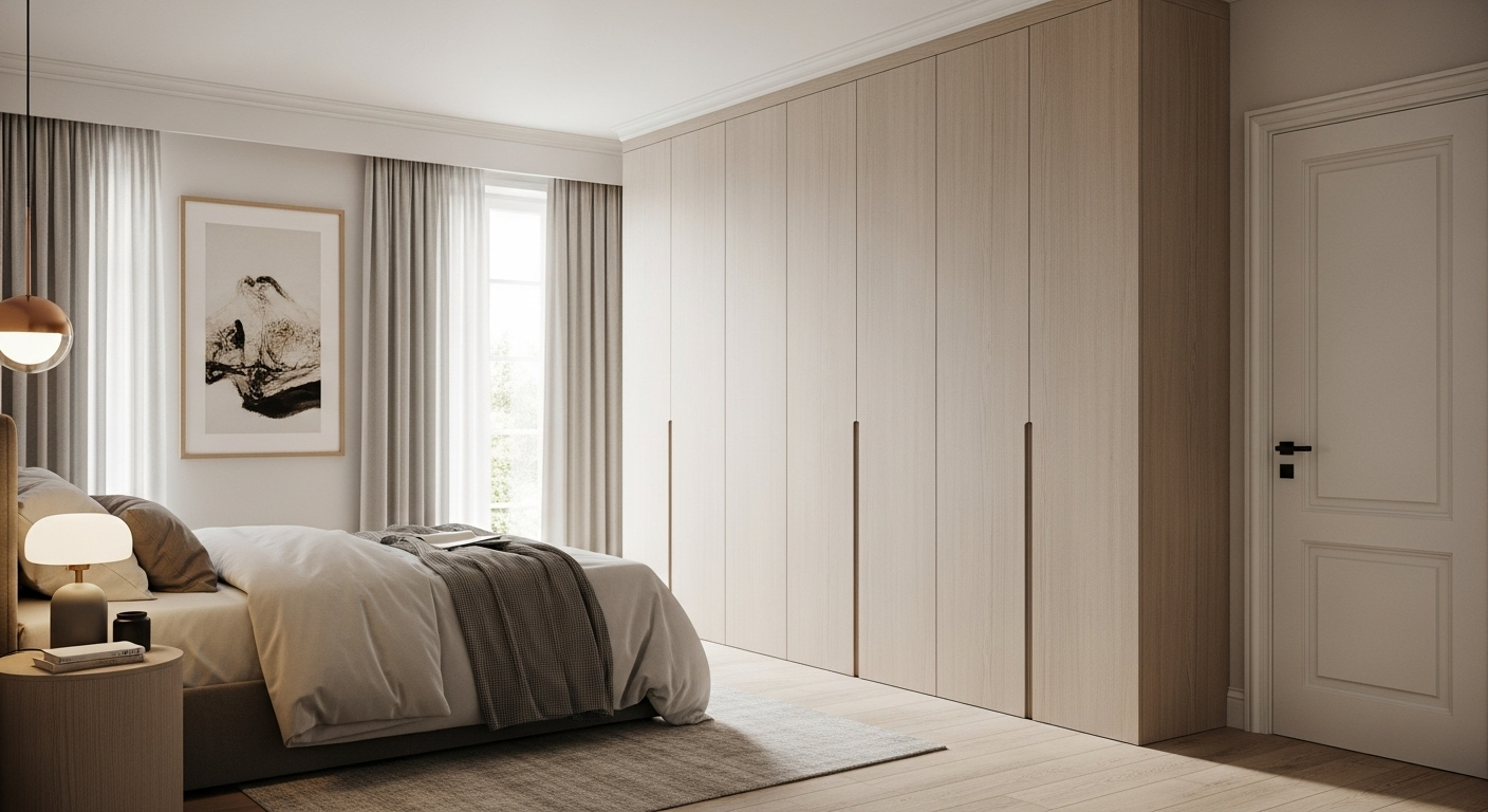 - Estética Limpia y Continua: Un armario que va de suelo a techo crea una superficie visualmente uniforme y elegante. Se integra perfectamente en la pared, dando una sensación de mayor amplitud y orden. El resultado es un acabado pulcro, similar al de un proyecto de interiorismo de alta gama.